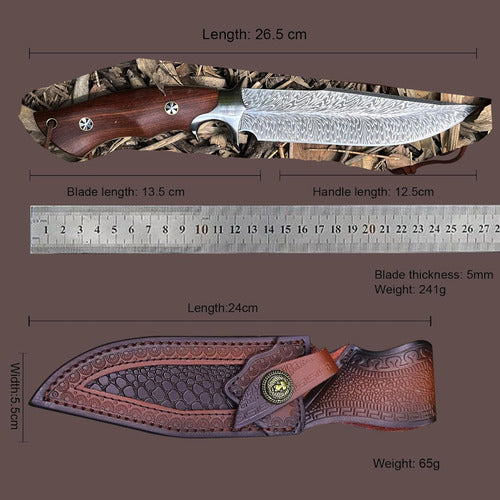 A/O Faca Luxo Saladin Fulltang Aço 5cr13 4mm Damasco + Bainha é uma faca de alta performance para uso em campo, caça, pesca e atividades ao ar livre.
